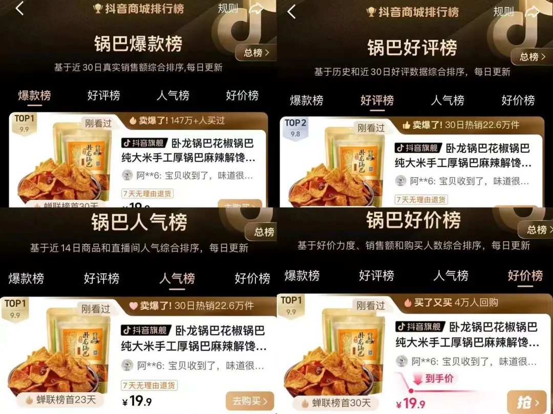 據抖音商城最新一期鍋巴人氣榜、爆款榜、好價榜,好評榜排名顯示。臥龍公司以“臥龍鍋巴、花椒鍋巴”兩大單品包攬人氣榜、爆款榜、好價榜TO1,是當之無愧的行業領軍者。
