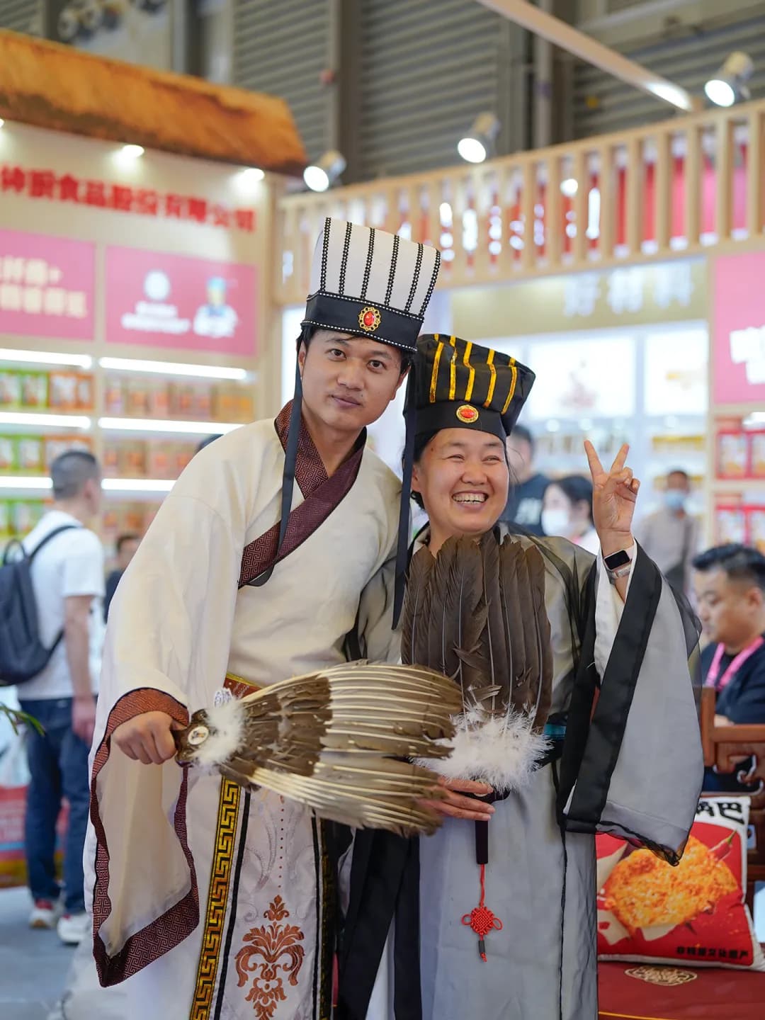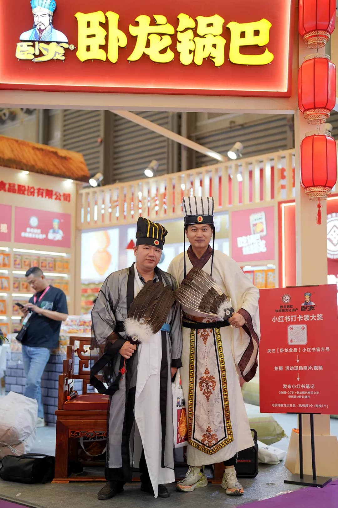 你以為只是靜態展陳?臥龍鍋巴直接把互動體驗拉滿!身著古裝的工作人員化身 “三國人物”,穿梭于展廳,與觀眾熱情互動,邀請他們品嘗美味的鍋巴。活動魅力非凡,眾多觀眾主動參與變裝,一襲漢服加身,手持羽扇,與臥龍茅廬背景相映成趣,宛如從歷史畫卷中走出,成為展會現場一道亮麗的風景線。